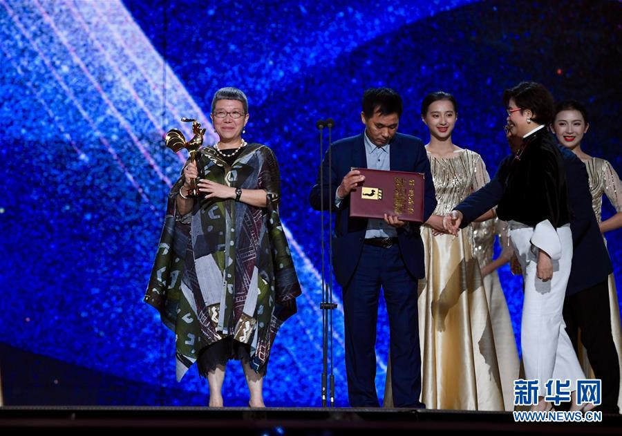 11月23日,最佳中小成本故事片獎獲獎電影《紅花綠葉》導(dǎo)演劉苗苗(左一)出席頒獎典禮。當日,第32屆中國電影金雞獎頒獎典禮在福建廈門舉行。新華社記者姜克紅攝