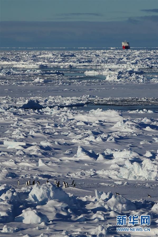 從“雪龍2”號(hào)上拍攝的企鵝群和“雪龍”號(hào)(11月19日攝)。新華社記者劉詩(shī)平攝