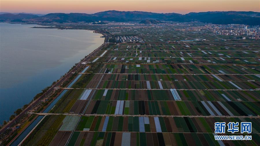 這是云南省玉溪市通??h的田園風(fēng)光(11月23日無人機(jī)拍攝)。初冬時節(jié),云南省玉溪市通海縣風(fēng)景秀麗,山巒、湖水與農(nóng)田組成了一幅美麗的田園詩畫卷。新華社記者胡超攝