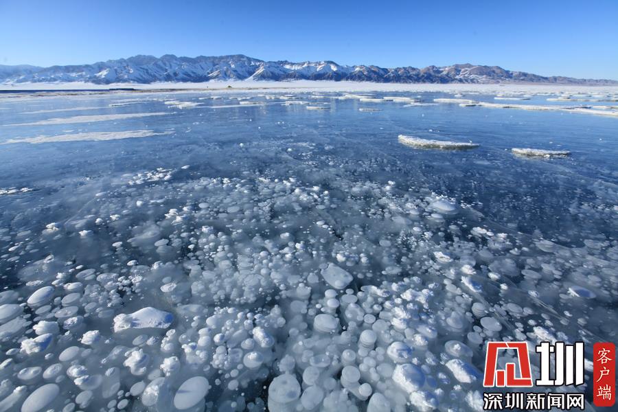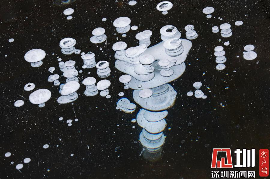 2019年11月26日,黑龍江漠河觀音山景區(qū)出現(xiàn)“冰泡”奇觀。透過晶瑩剔透的冰面,可以看到一串串潔白氣泡分布在冰層中。