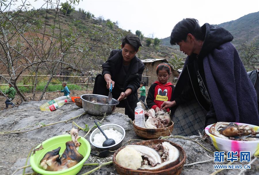 11月24日,在昭覺縣支爾莫鄉(xiāng)阿土列爾村,當(dāng)?shù)鼐用駵?zhǔn)備熟食、酒等食物祭祖,并相互贈(zèng)送。11月20日至26日是四川省涼山彝族自治州大小涼山彝族群眾傳統(tǒng)節(jié)日——彝族年,懸崖上的阿土列爾村的彝族群眾殺年豬、祭祀和走親拜年,慶祝一年一度的彝族年。阿土列爾村是“懸崖村”,位于四川省涼山彝族自治州昭覺縣支爾莫鄉(xiāng),坐落在海拔1400-1600米山坳中,這里居住著60多戶彝族群眾,村民走出大山,需要攀爬懸崖。新華社記者江宏景攝