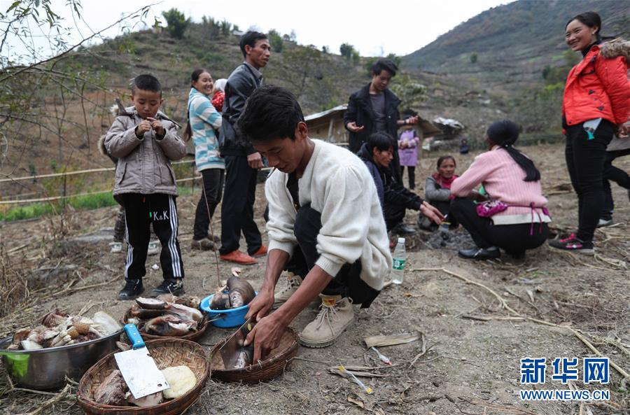 11月24日,在昭覺縣支爾莫鄉(xiāng)阿土列爾村,阿紅在切煮熟的豬肉和羊肉,準(zhǔn)備跟鄰居分享。新華社記者江宏景攝