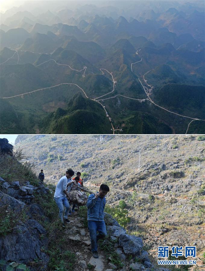 拼版照片:上圖為已經(jīng)修通水泥路的大化瑤族自治縣板升鄉(xiāng)八好村八好屯(11月11日無人機(jī)拍攝);下圖為在尚未通路的八好村八好屯,村民背著年貨走山路回家(2016年1月26日攝)。新華社記者黃孝邦攝