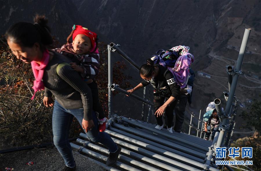彝族年期間,幾名彝族群眾爬上鋼梯來(lái)到阿土列爾村拜年(11月24日攝)。新華社記者江宏景攝