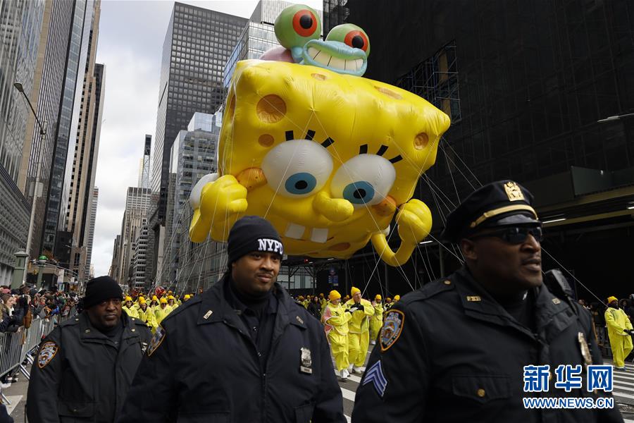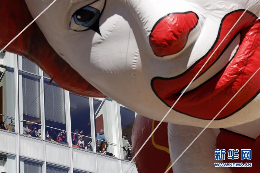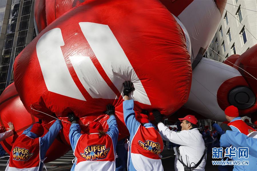 11月28日,在美國紐約舉行的感恩節(jié)大游行上,卡通氣球行進在曼哈頓街頭。  新華社記者 李木子 攝