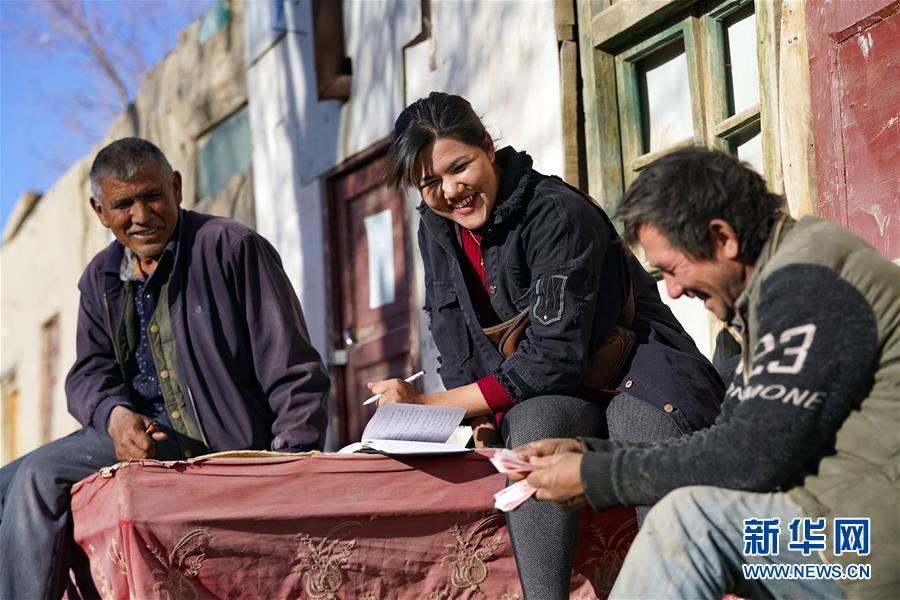 在地處塔克拉瑪干沙漠腹地的新疆于田縣達里雅布依鄉(xiāng),庫爾班罕·買提肉孜(中)與養(yǎng)羊合作社的合作伙伴結算購買羊肉的費用(11月13日攝)。