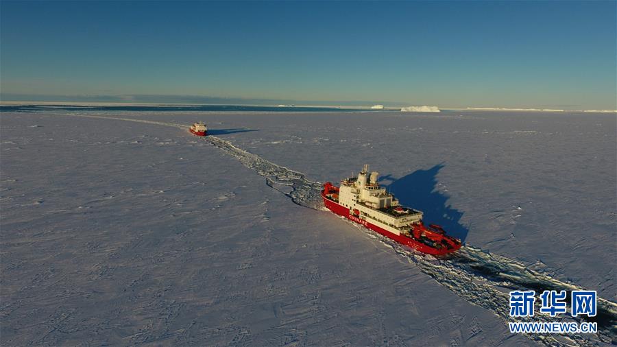 “雪龍”號與“雪龍2”號在新開辟的航道上(11月21日無人機拍攝)。