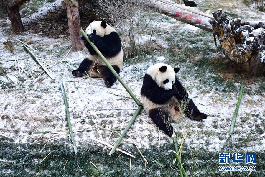 11月29日,在西寧熊貓館內(nèi),兩只大熊貓?jiān)诔灾褡印?當(dāng)日,青海省西寧市迎來降雪,西寧熊貓館四只“萌寵”大熊貓?jiān)谘┨炖锵硎苤灾褡拥臉啡?。?jù)了解,大熊貓生活的適宜溫度在26攝氏度至零下5攝氏度之間,冬季氣溫低于零下5攝氏度時,場館會啟用保暖設(shè)施。 新華社記者 吳剛 攝