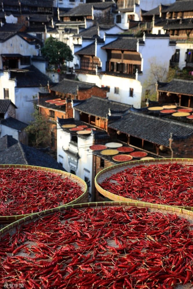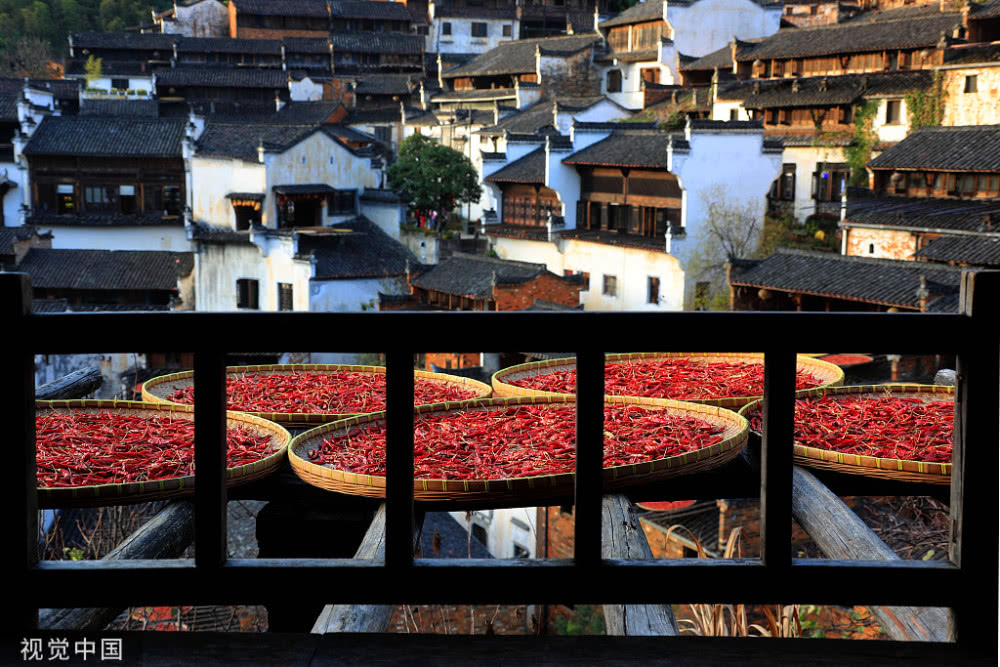 2018年8月7日,江西婺源縣篁嶺古村落,壯觀“曬秋”場(chǎng)景。當(dāng)日立秋節(jié)氣,江西婺源縣篁嶺古村的農(nóng)作物普遍豐收,村民們又迎來了一年一度的“曬秋”季。村民們將收獲來的紅辣椒、玉米、南瓜、稻谷和菊花等色彩斑斕的農(nóng)作物,晾曬在依山而建的徽派民居房前屋后的木制曬架上,在秋日陽光的照射下,色彩繽紛圓圓的曬扁,鋪就在錯(cuò)落有致的徽派民居之間,格外璀璨奪目,蔚為壯觀。目前,“篁嶺曬秋”已經(jīng)成為中國鄉(xiāng)村旅游的一張名片。