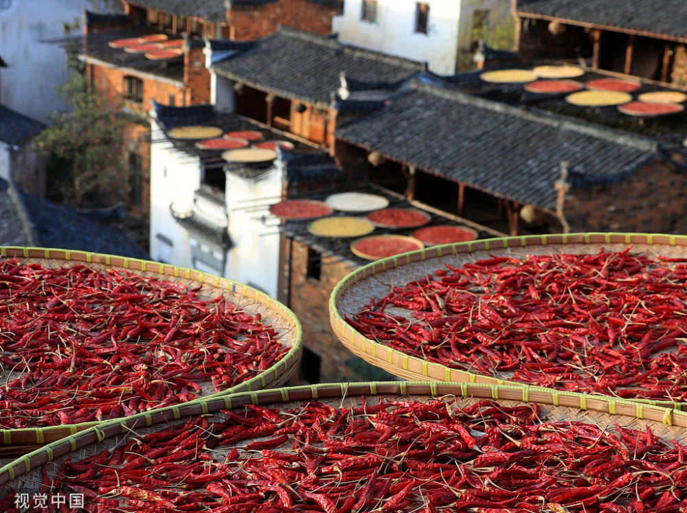 秋天,是收獲的季節(jié)。安徽省黃山市呈坎古村村民將收獲歸倉的玉米、黃豆、紅辣椒等農(nóng)作物果實(shí)因地制宜晾曬,在古村曬場(chǎng)上描繪出一幅豐收曬秋圖。