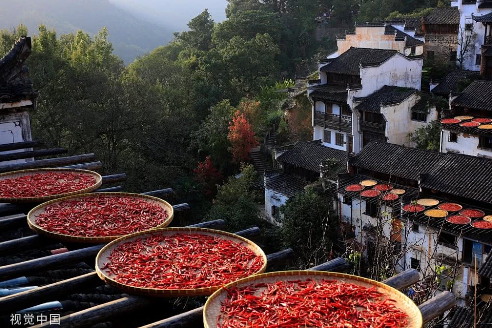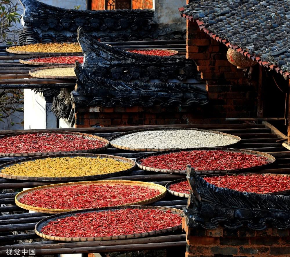 色彩斑斕的圓圓的曬匾,與依山而建的徽派古民居交相輝映,炫彩奪目。