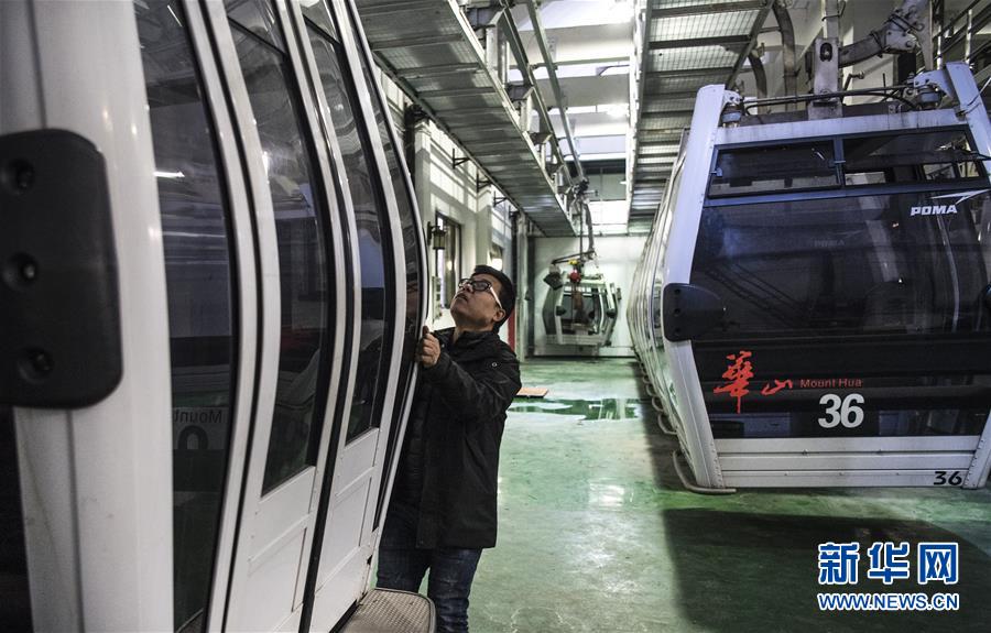 華山太華索道檢修人員在檢查吊廂門(mén)開(kāi)關(guān)(12月6日攝)。新華社記者陶明攝