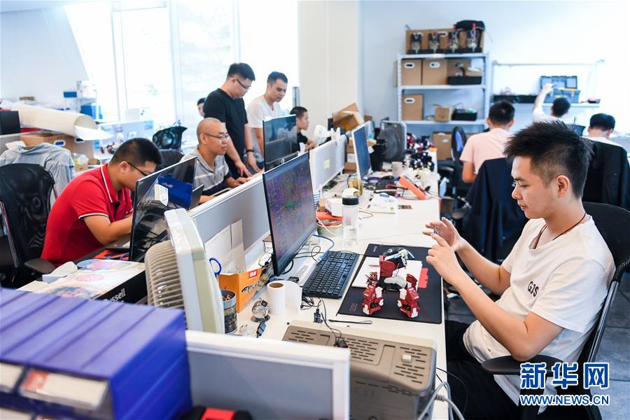 在深圳前海深港青年夢工場,創(chuàng)業(yè)者招俊健(前右)與團(tuán)隊(duì)成員在辦公室工作(2018年10月25日攝)。 新華社記者 毛思倩 攝