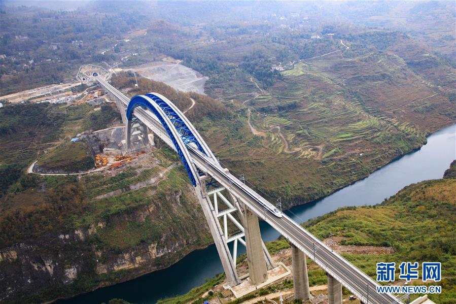 12月2日,一輛試驗(yàn)列車駛過(guò)成貴高鐵鴨池河特大橋。新華社記者劉續(xù)攝