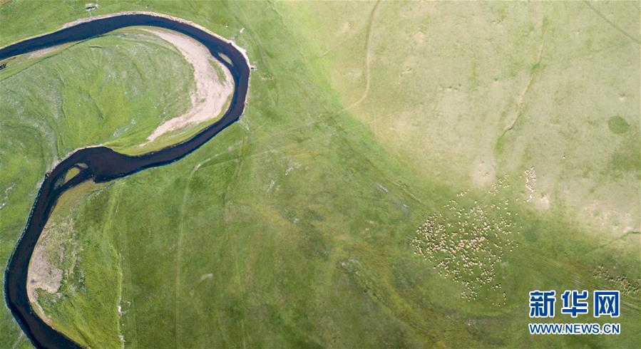 8月29日無人機拍攝的內蒙古呼倫貝爾市陳巴爾虎旗境內的莫日格勒河與羊群。新華社記者李京攝