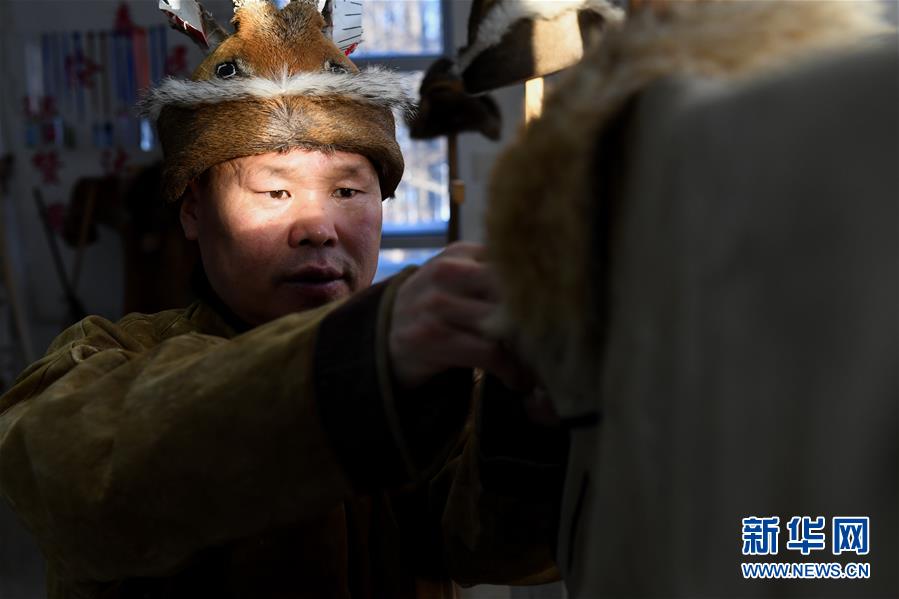 12月10日,在古里鄉(xiāng)非遺傳習所,鄂倫春族人吳曲忠在整理一件皮制衣服。新華社記者劉磊攝