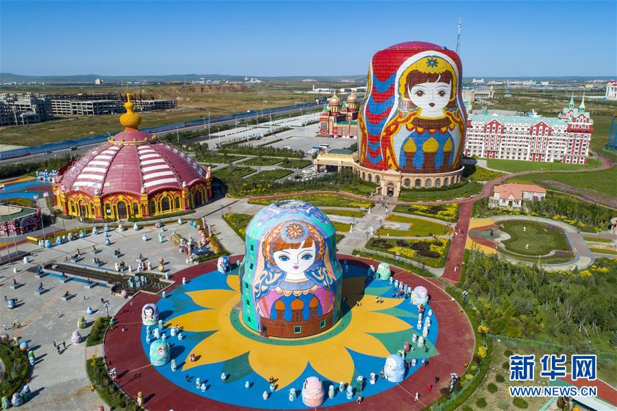 8月29日無人機拍攝的滿洲里市套娃廣場景區(qū)。滿洲里市位于呼倫貝爾大草原腹地。新華社記者沈伯韓攝