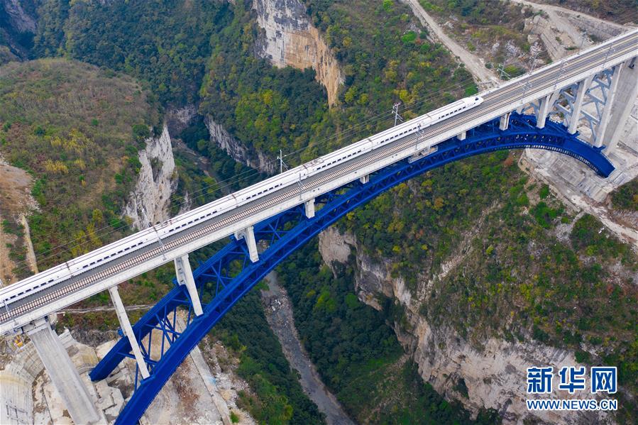 12月2日,一輛試驗(yàn)列車駛過(guò)成貴高鐵西溪河大橋(無(wú)人機(jī)拍攝)。新華社記者劉續(xù)攝
