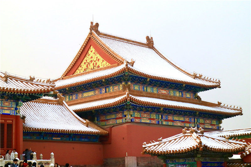 12月16日,在北京故宮,兩只喜鵲停在太和殿上。當(dāng)日,北京迎來降雪天氣。新華社記者金良快攝