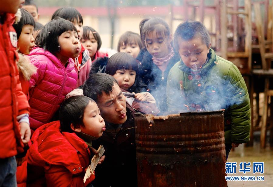 1月3日,在江西省鷹潭市余江區(qū)春濤鎮(zhèn)黃泥小學,老師章站亮(前右)和學生們一起生火。由于生火用的材料均是廢棄的桌椅或者枯葉,點火后得不停地靠嘴吹氣才能燒得旺盛。2018年9月,44歲的章站亮來到黃泥小學擔任校長,黃泥小學物質(zhì)條件艱苦,沒有食堂。他每月自費買菜為孩子們義務(wù)加餐,被孩子們稱為“廚神爸爸”。新華社記者胡晨歡攝
