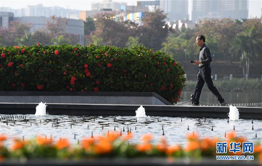 12月17日,市民從南寧市南湖邊綠樹(shù)鮮花間走過(guò)。 新華社記者 陸波岸 攝
