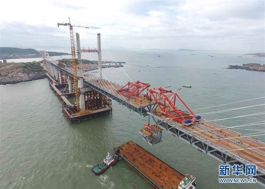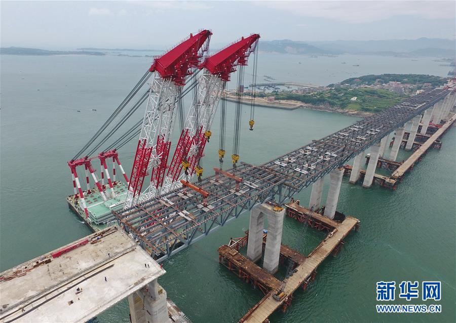 9月21日,平潭海峽公鐵大橋鼓嶼門航道橋的鋼桁梁在吊裝中(無人機(jī)拍攝)。9月25日上午,隨著一段長17米、重473噸的鋼桁梁被精確固定到位,總長16.34公里的平潭海峽公鐵大橋合龍貫通。平潭海峽公鐵大橋是福州至平潭鐵路控制性工程,也是“十三五”規(guī)劃中北京至臺灣高鐵的先期工程。大橋起于福州市長樂區(qū),“踏”過四座小島后抵達(dá)中國第五大島平潭,上層設(shè)計(jì)為時速100公里的六車道高速公路,下層為設(shè)計(jì)時速200公里的高鐵。據(jù)福建福平鐵路公司介紹,大橋計(jì)劃2020年正式通車。在六年建設(shè)過程中,平潭海峽公鐵大橋所應(yīng)用研發(fā)的多項(xiàng)技術(shù)、裝備創(chuàng)下國內(nèi)外紀(jì)錄。新華社記者林善傳攝