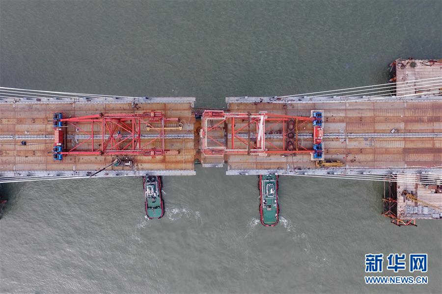 9月21日,平潭海峽公鐵大橋鼓嶼門航道橋鋼桁梁被架梁起重機穩(wěn)穩(wěn)地提升起來(無人機拍攝)。新華社記者林善傳攝