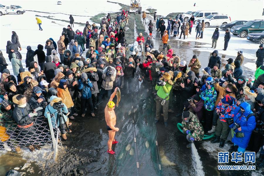 12月18日,一名冬泳愛好者展示冬捕魚(無人機拍攝)。 當日,位于內(nèi)蒙古呼倫貝爾大草原上的諾干湖舉行冬捕活動,吸引不少游客前來觀看。冬日的諾干湖冰雪覆蓋,諾干湖冬捕也是當?shù)囟韭糜蔚奶厣顒又弧?新華社記者 劉磊 攝