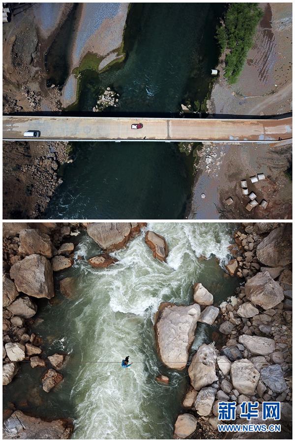 拼版照片:上圖為貴州省威寧縣海拉鎮(zhèn)海元村“溜索改橋”后的場(chǎng)景(2018年3月12日無人機(jī)拍攝);下圖為貴州省威寧縣海拉鎮(zhèn)花果村的村民利用尚未拆除的溜索過江(2018年3月12日無人機(jī)拍攝)。
