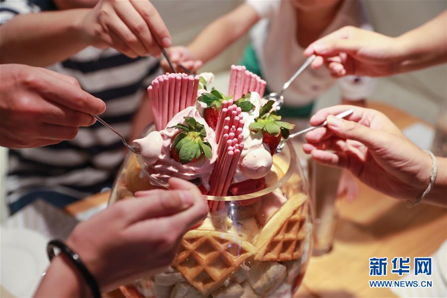 2019年7月28日,在泰國曼谷,顧客在一家冰淇淋店分享冰淇淋。這家冰淇淋店因?yàn)槠涑罂畹谋苛茏呒t網(wǎng)絡(luò),吸引許多游客前去拍照打卡。 新華社記者 張可任 攝