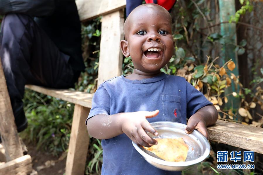 2019年9月1日,在肯尼亞內(nèi)羅畢的一個(gè)街邊攤位,一名兒童品嘗薩摩薩。肯尼亞及東非地區(qū)的傳統(tǒng)面食薩摩薩是一種三角形的油酥點(diǎn)心,由薄面皮包裹豆類(lèi)、蔬菜及牛羊肉餡后,下鍋油炸而成。 新華社記者 王騰 攝