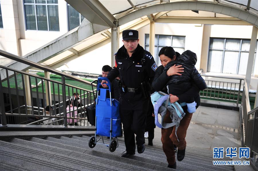 金寨火車站派出所民警何津超(前左)幫助旅客搬運(yùn)行李(12月19日攝)。新華社記者鄧堅攝