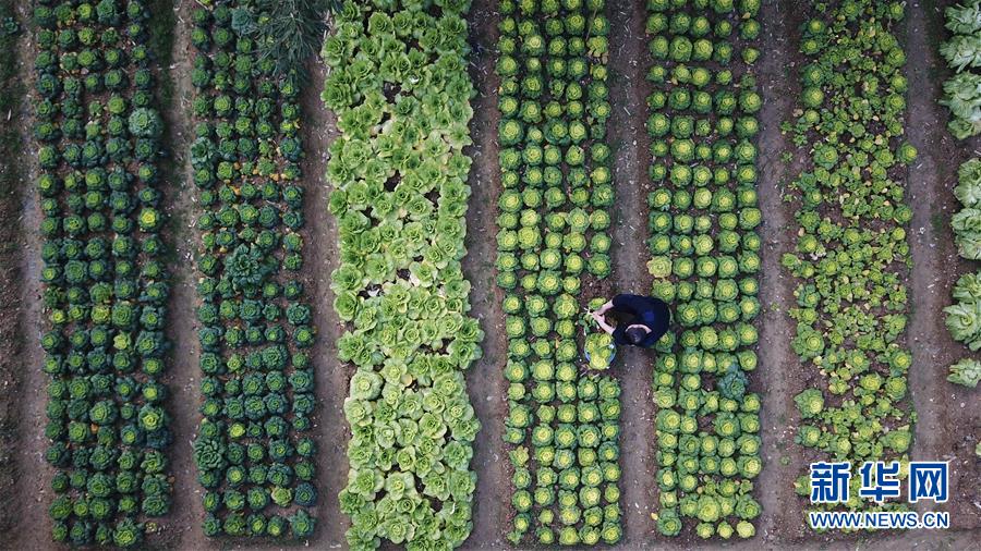 金寨火車站派出所民警呂錦鵬在菜園摘菜(12月19日無人機(jī)拍攝)。由于金寨火車站派出所離縣城較遠(yuǎn),平時買菜不方便,民警們在院子里開墾了一處小菜園。新華社記者張端攝