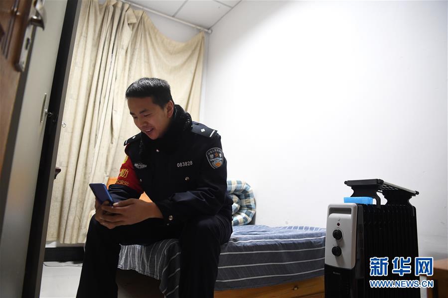 12月18日,常曉龍(右)和輔警在治安崗?fù)だ锝涣鳌P氯A社記者劉軍喜攝