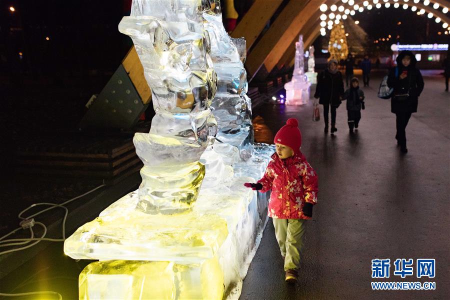 12月24日,在俄羅斯首都莫斯科,小朋友參觀冰雕藝術展。 新華社記者 白雪騏 攝