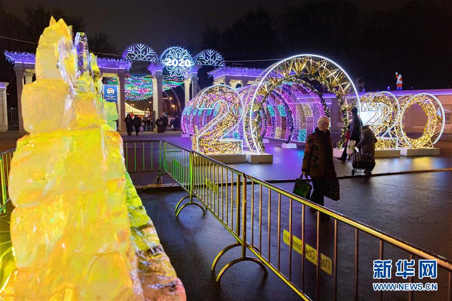 12月24日,在俄羅斯首都莫斯科,一名行人觀看冰雕。 新華社記者 白雪騏 攝