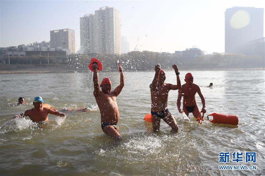 12月21日,冬泳愛好者在上岸前向身上潑水。新華社記者陳斌攝
