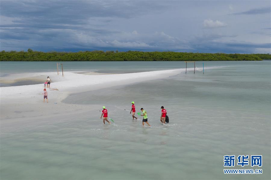 12月8日,在印度尼西亞邦加勿里洞省,李嘉文(右二)帶領工人在李王島的白色海床清理垃圾。(無人機拍攝) 新華社記者杜宇攝