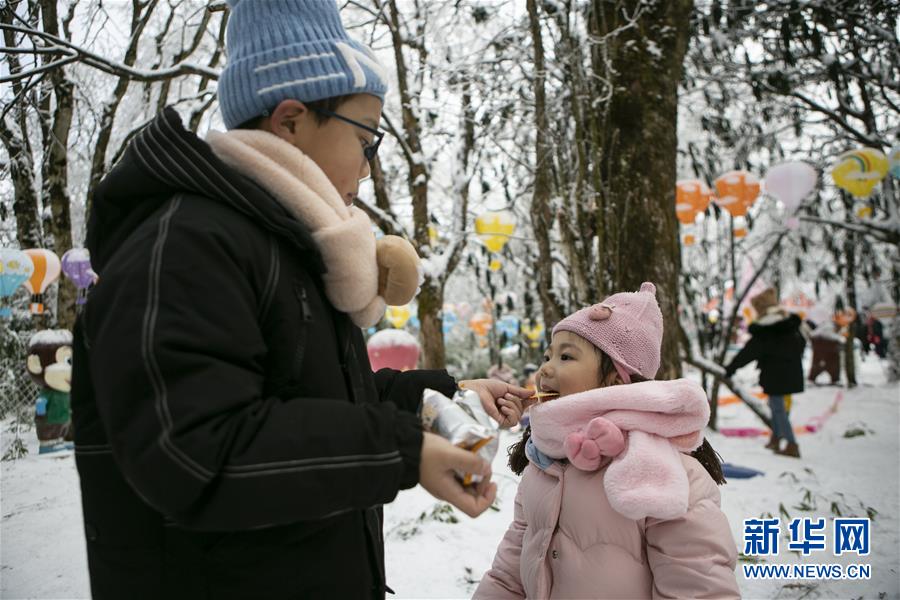 12月28日,小朋友在峨眉山風(fēng)景名勝區(qū)吃零食。新華社記者李夢馨攝
