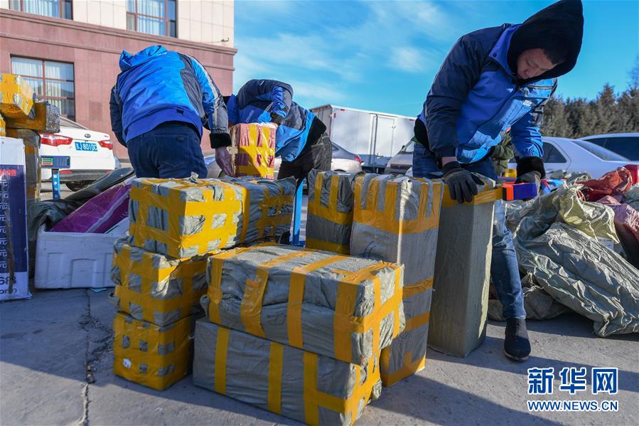 12月27日,在吉林松原查干湖漁場(chǎng),快遞員將魚打包準(zhǔn)備發(fā)給客戶。新華社記者張楠攝