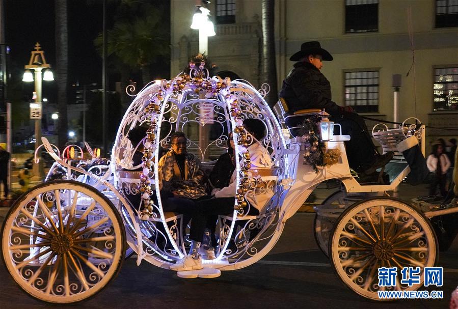 12月29日,人們在美國加利福尼亞州里弗賽德燈光節(jié)上乘坐馬車。  新華社記者李穎攝