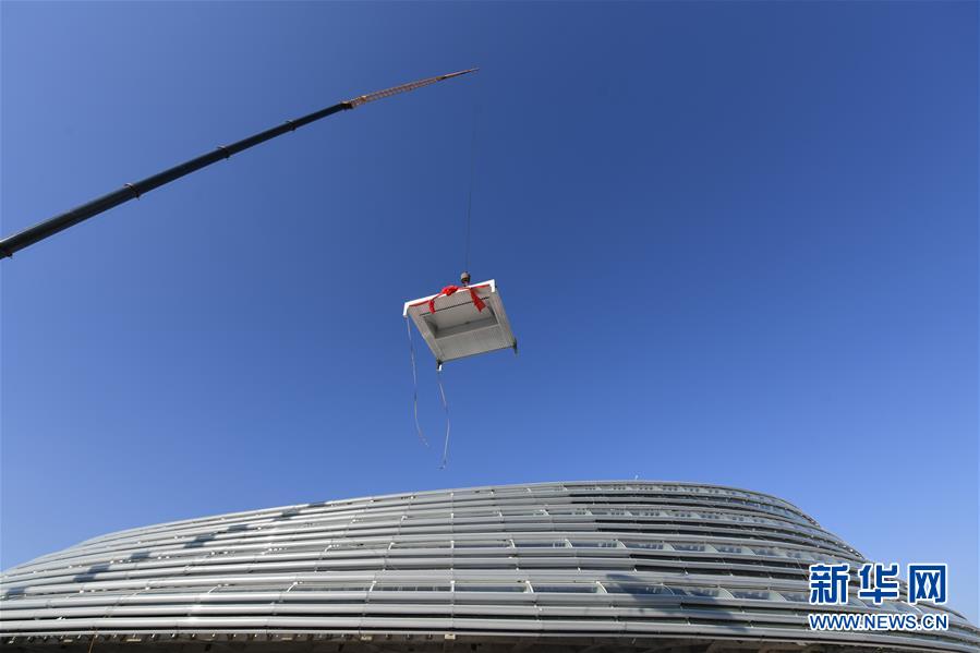 12月31日,施工人員在國家速滑館施工現(xiàn)場安裝最后一塊屋面單元板塊。新華社記者鞠煥宗攝