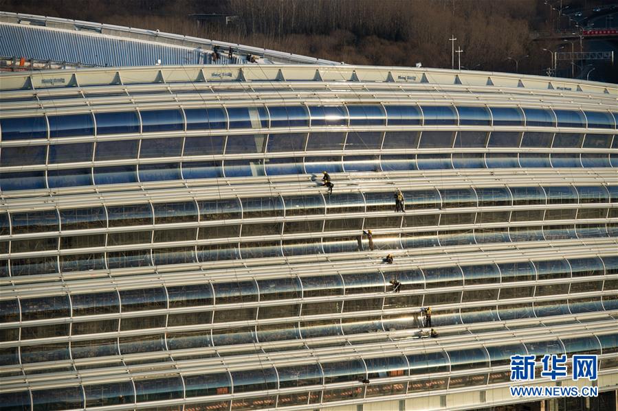 12月31日,施工人員在實(shí)現(xiàn)封頂封圍的國家速滑館施工現(xiàn)場工作。新華社記者鞠煥宗攝