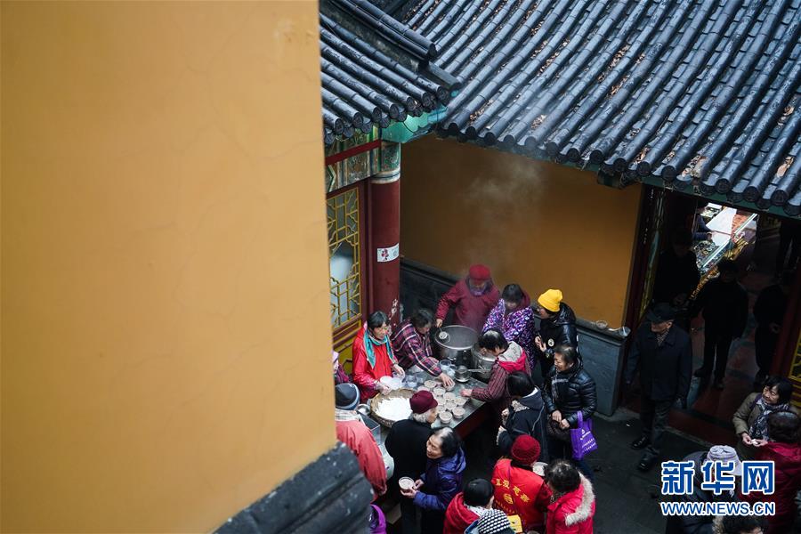1月2日,在南京玄奘寺,工作人員在給市民贈(zèng)粥。 當(dāng)日是農(nóng)歷臘月初八,中國(guó)傳統(tǒng)臘八節(jié)。 新華社記者 季春鵬 攝