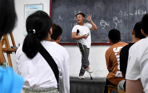 2019年9月9日,在位于西安市的陜西省城市經(jīng)濟學校,計算機平面設計專業(yè)的美術老師王旭陽在給新生講授繪畫基礎知識。該校是西安唯一一所針對殘障人士設立的特殊教育中等職業(yè)學校。新華社記者劉瀟攝