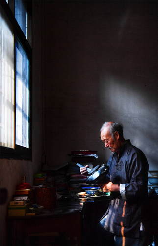 2019年10月12日,在江西省鄱陽縣鄱陽鎮(zhèn),76歲的“鄱陽脫胎漆器髹飾技藝”國家級非物質文化遺產(chǎn)代表性傳承人丁國坤在家中為一件未成形的脫胎漆器“上漆”。新華社記者胡晨歡攝