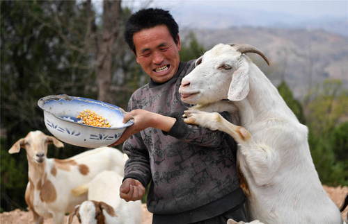 2019年3月27日,在河南省盧氏縣沙河鄉(xiāng)果角村,村民任當鋒在喂羊。41歲的任當鋒曾多年在外打工,由于腰部有傷不能干重活。2018年,在知悉盧氏縣的金融扶貧政策后,任當鋒返鄉(xiāng)創(chuàng)業(yè),用貸來的5萬元無擔保無抵押小額貸款,購買了38只羊,從打工仔變成了一個羊倌。 新華社記者李嘉南攝