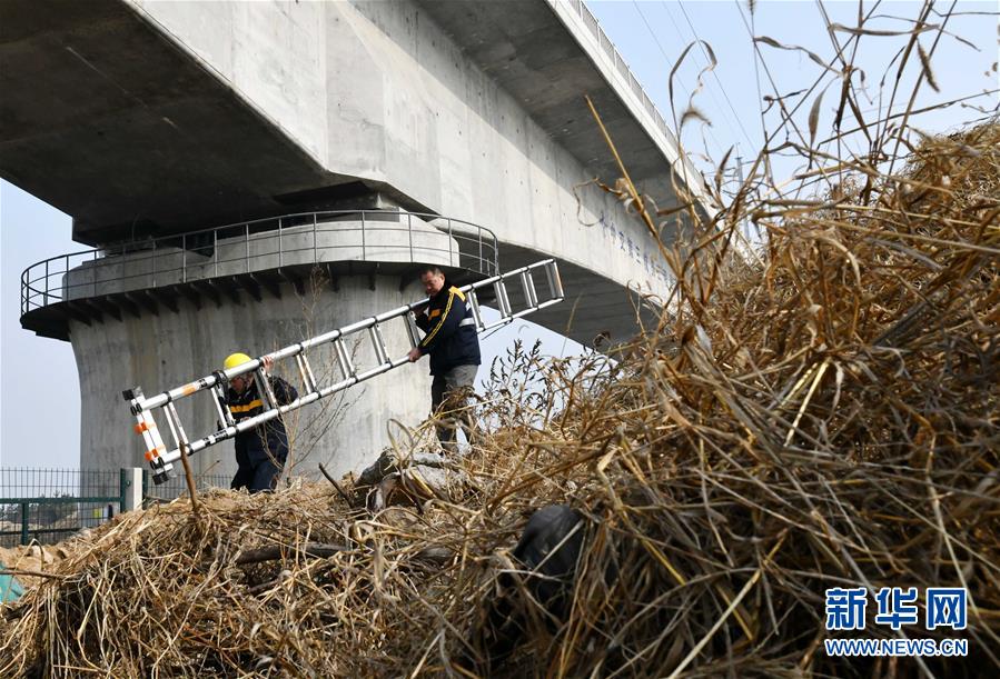 1月3日,中國鐵路濟南局臨沂工務段工程技術員在沂河特大橋橋下搬運工具。新華社記者 朱崢攝