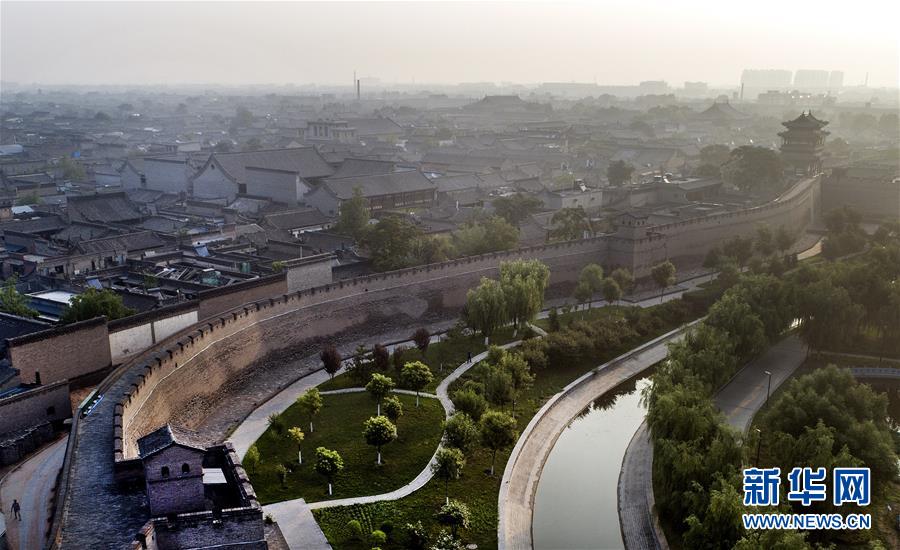這是7月20日無人機拍攝的平遙古城墻與護城河。平遙古城城墻總周長6163米,墻高約12米,把面積約2.25平方公里的平遙縣城隔為兩個風格迥異的世界。城墻以內(nèi)街道、鋪面、市樓保留明清形制,城墻以外為新城。