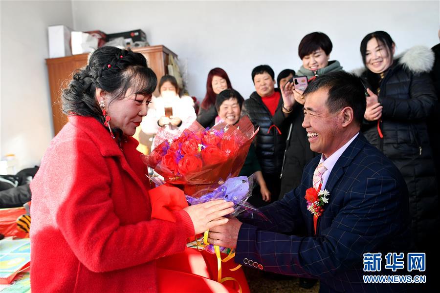 在和順縣李陽(yáng)鎮(zhèn)南李陽(yáng)村,新郎馬愛明將花送給新娘溫麗芳(2019年12月31日攝)。 農(nóng)歷臘月初六,是山西省和順縣李陽(yáng)鎮(zhèn)下石勒村45歲的馬愛明娶媳婦的日子。 地處太行山區(qū)的下石勒村曾深陷貧困,“地下無資源、地上沒產(chǎn)業(yè)”是這里的真實(shí)寫照。2013年,村里638口人中有511口屬貧困人口。村民在貧瘠的坡地上種的玉米、谷子等僅夠糊口,外村女子都不愿嫁到這里。和村里多數(shù)人一樣,貧困戶馬愛明不得不在農(nóng)閑時(shí)出去打工補(bǔ)貼家用。東走走、西走走,馬愛明沒攢下錢,也沒遇見合適的人,婚事一拖再拖,成了大齡“光棍”。 2013年以來,在國(guó)家強(qiáng)有力的政策幫扶和基層黨組織的帶領(lǐng)下,下石勒村以合作社的形式發(fā)展起肉牛養(yǎng)殖、雙孢菇種植、萬壽菊種植等集體產(chǎn)業(yè)。下石勒村經(jīng)濟(jì)有了起色,外出打工的村民紛紛回村。馬愛明加入了村里的建筑隊(duì),閑時(shí)還到種植專業(yè)合作社打工,一年四季都有活干。加上土地流轉(zhuǎn)的收入,馬愛明一年能收入三萬多元。2016年,下石勒村實(shí)現(xiàn)整村脫貧。 2019年,馬愛明結(jié)識(shí)了在下石勒村肉雞養(yǎng)殖專業(yè)合作社打工的李陽(yáng)鎮(zhèn)南李陽(yáng)村村民溫麗芳,馬愛明的樸實(shí)、善良、勤勞打動(dòng)了溫麗芳,兩人擦出了愛情的火花。 臘月初六這天,下石勒村鑼鼓喧天,嗩吶齊鳴。在鄉(xiāng)親們的見證下,馬愛明手牽新娘,大聲宣布:“我脫單了!我的幸福生活開始了!” 新華社記者 詹彥 攝